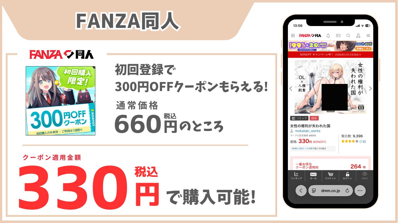 FANZA同人も、DLsiteと同じく初回登録限定の300円クーポンが配布されています。